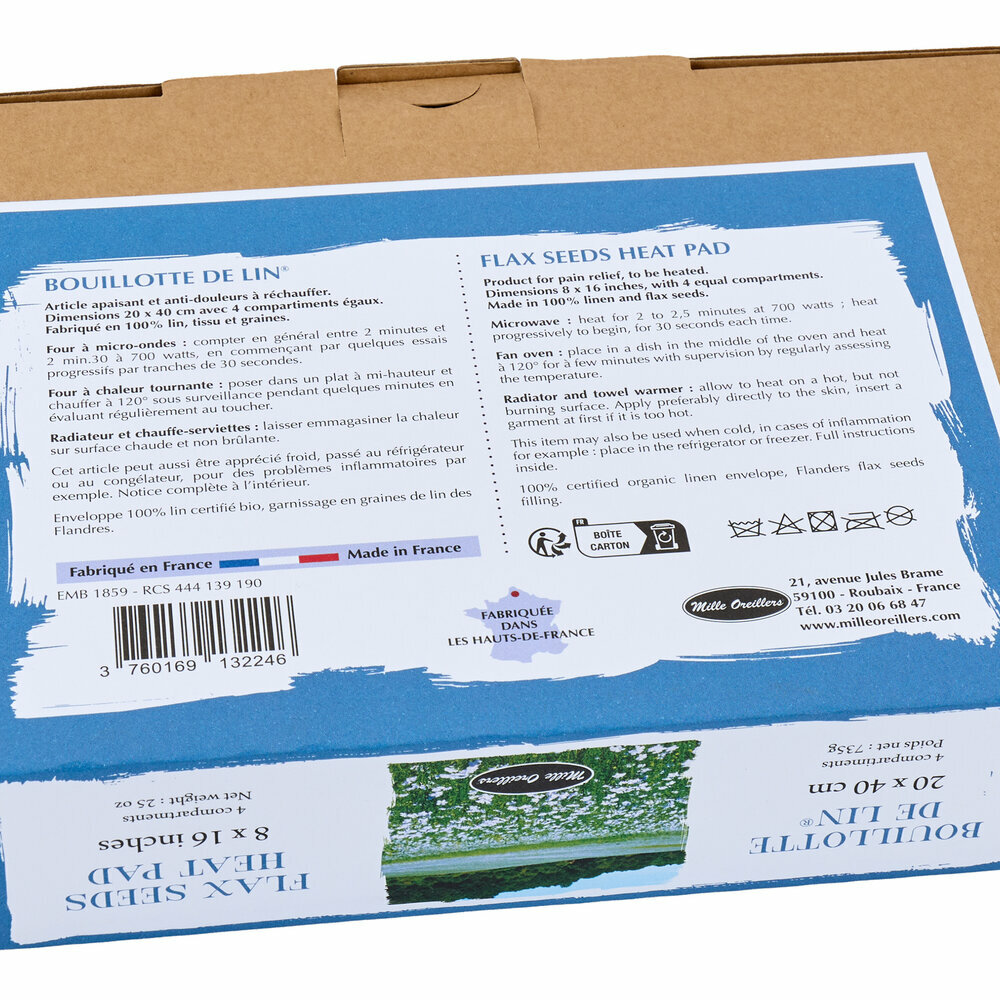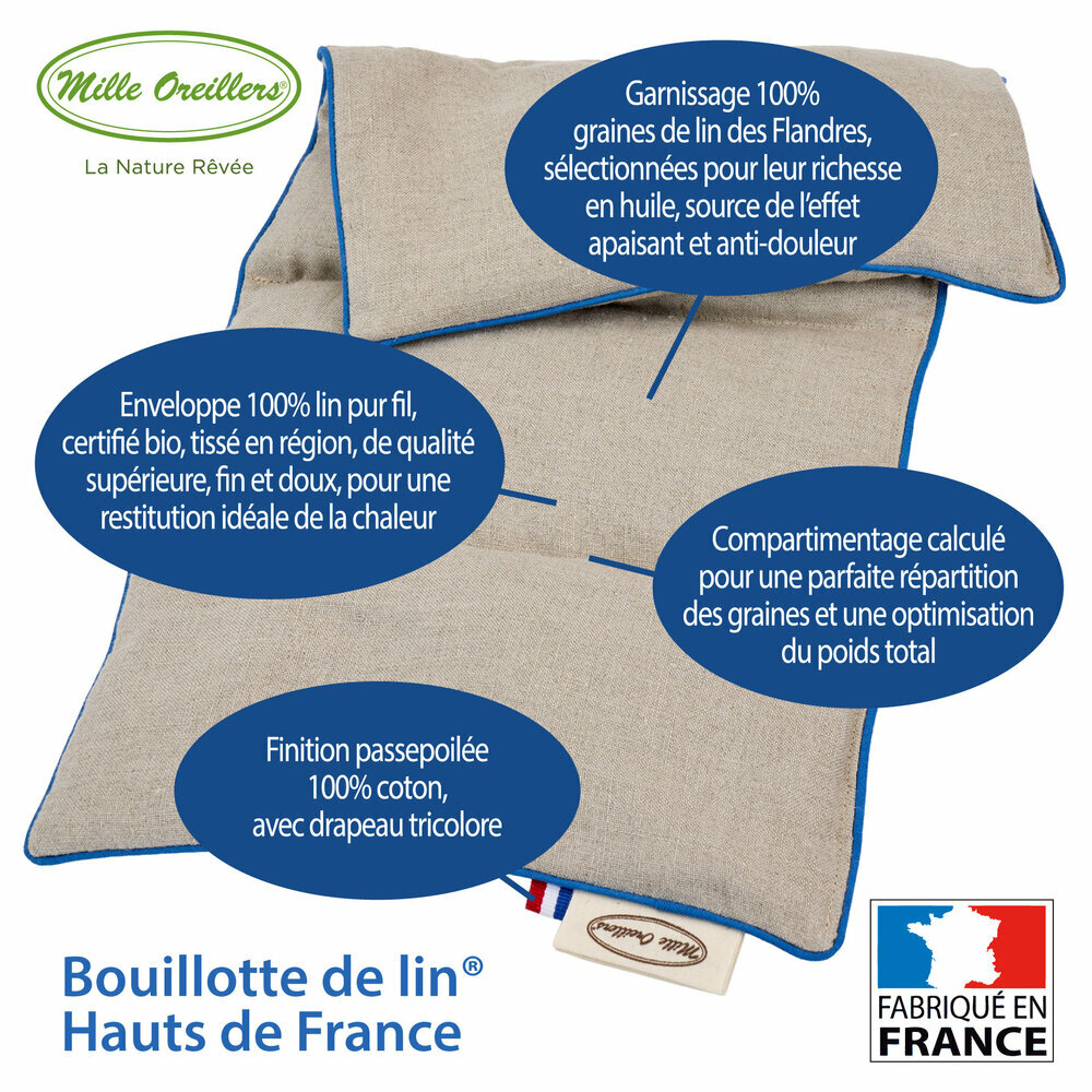 Découvrez la bouillotte de lin® Hauts de France Mille Oreillers, la plus régionale des bouillottes aux graines de lin de la marque ! Elle rend hommage à la région du Nord de la France où réside cette culture si spécifique du lin textile ainsi que le lieu de confection de tous ses articles.
