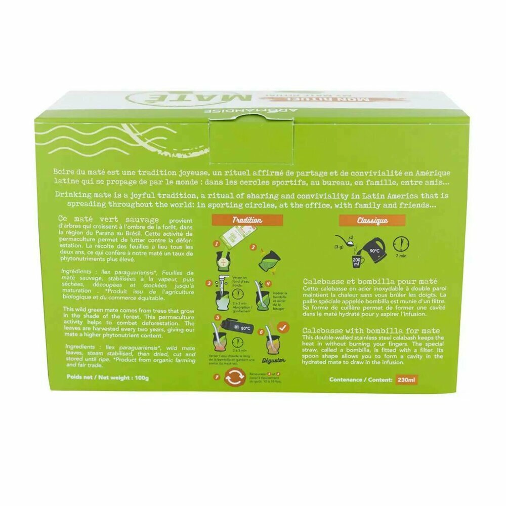 Ce coffret complet réunit une calebasse double paroi en acier inoxydable, une bombilla en inox avec filtre et un maté bio (100g) présenté dans une jolie boîte métal, idéale pour conserver toute la fraîcheur des feuilles.